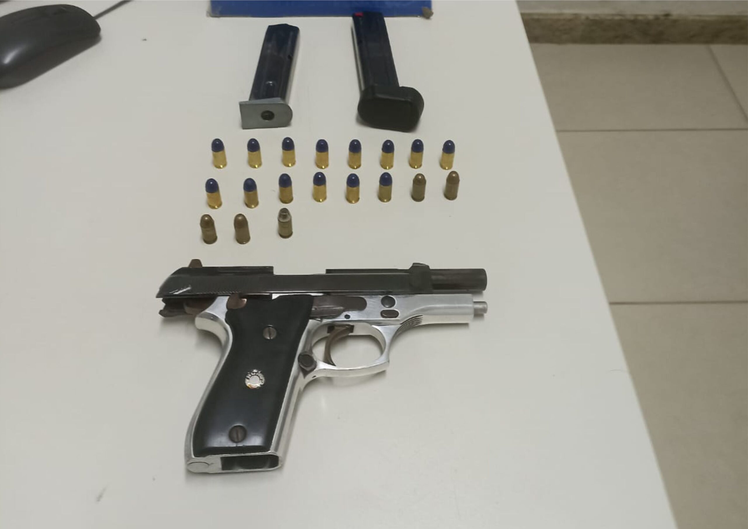 Diante da situação, foi dada ordem de parada ao suspeito, sendo realizada a abordagem e a busca pessoal. Durante a revista, os policiais localizaram uma pistola calibre 380 na cintura do indivíduo, acompanhada de um carregador com capacidade para 19 projéteis, contendo 14 munições intactas. Ainda durante a ação, foi encontrado no bolso direito outro carregador com capacidade para 12 projéteis, municiado com 5 munições intactas.